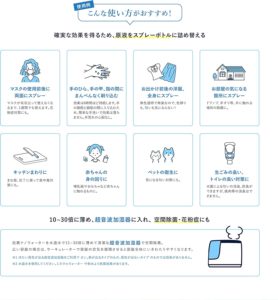 スプレーするだけで菌の働きを抑える仕組みを持ち、空間や物の衛生管理に活用できます。
