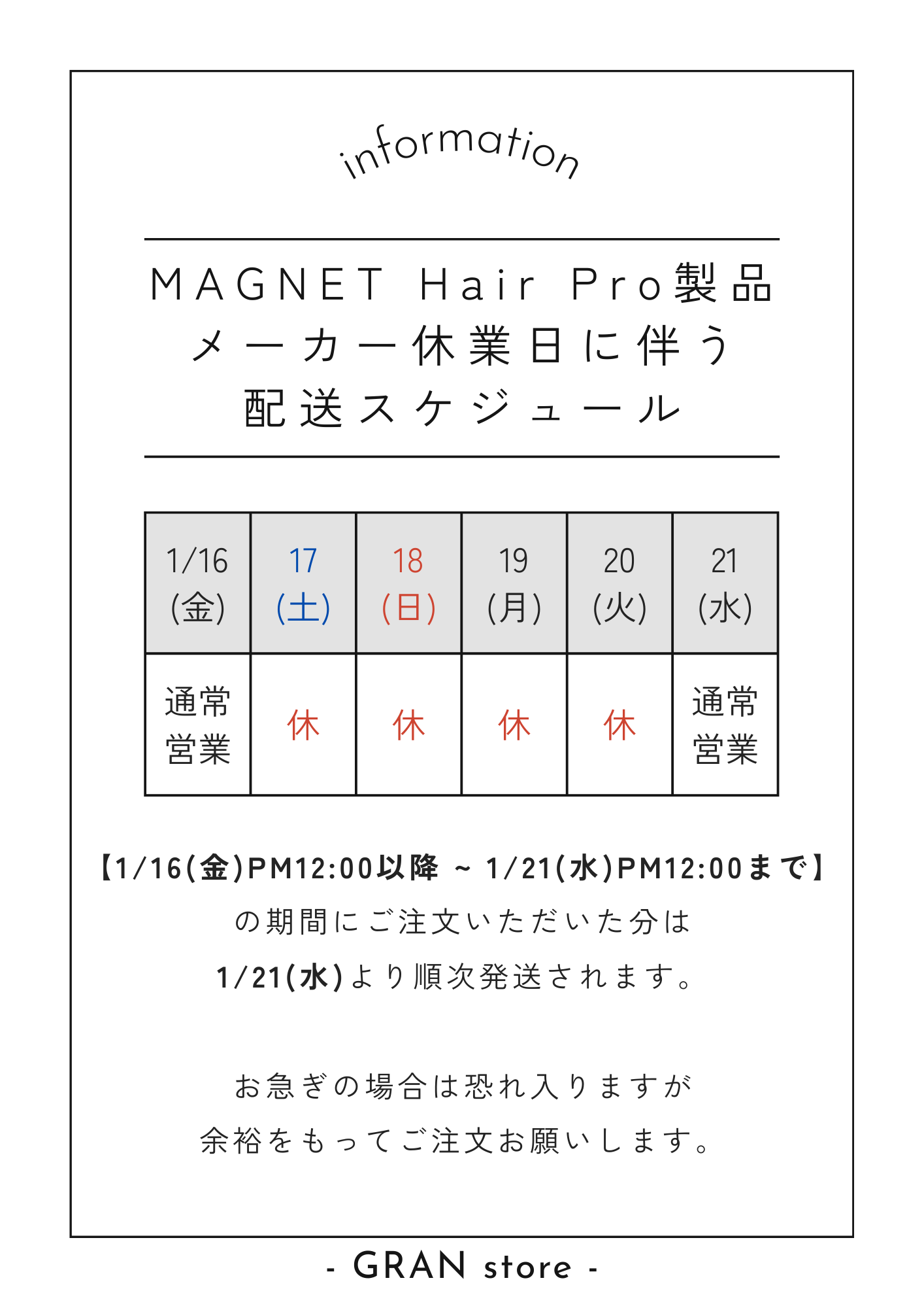 MAGNET Hair Pro メーカ-臨時休業日のご案内